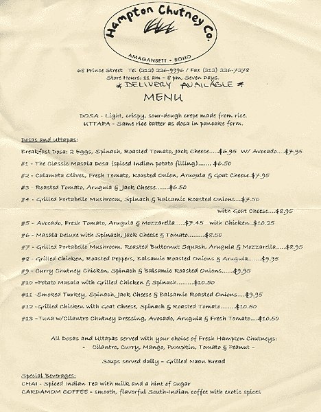 Neither the Hamptons nor chutney have ever held any interest for me, but I've had a soft spot for masala dosa ever since an Indian friend ordered us one at a small restaurant east of Seattle. The dosa is a thin sourdough rice flour pancake wrapped around spicy mashed potato, like a potato burrito from south India. Hampton Chutney asks the obvious question, "What else could we wrap in such a pancake?" The answers include portobello, spinach, balsamic roasted onions, arugula, chicken, and tuna (not all at once), served with your choice of chutney. The dosa pancake is admirably prepared, lacy and crisp, and the filling (mine was chicken, arugula, peppers, and onions, with a side of peanut chutney) is flavorful if not particularly spicy.